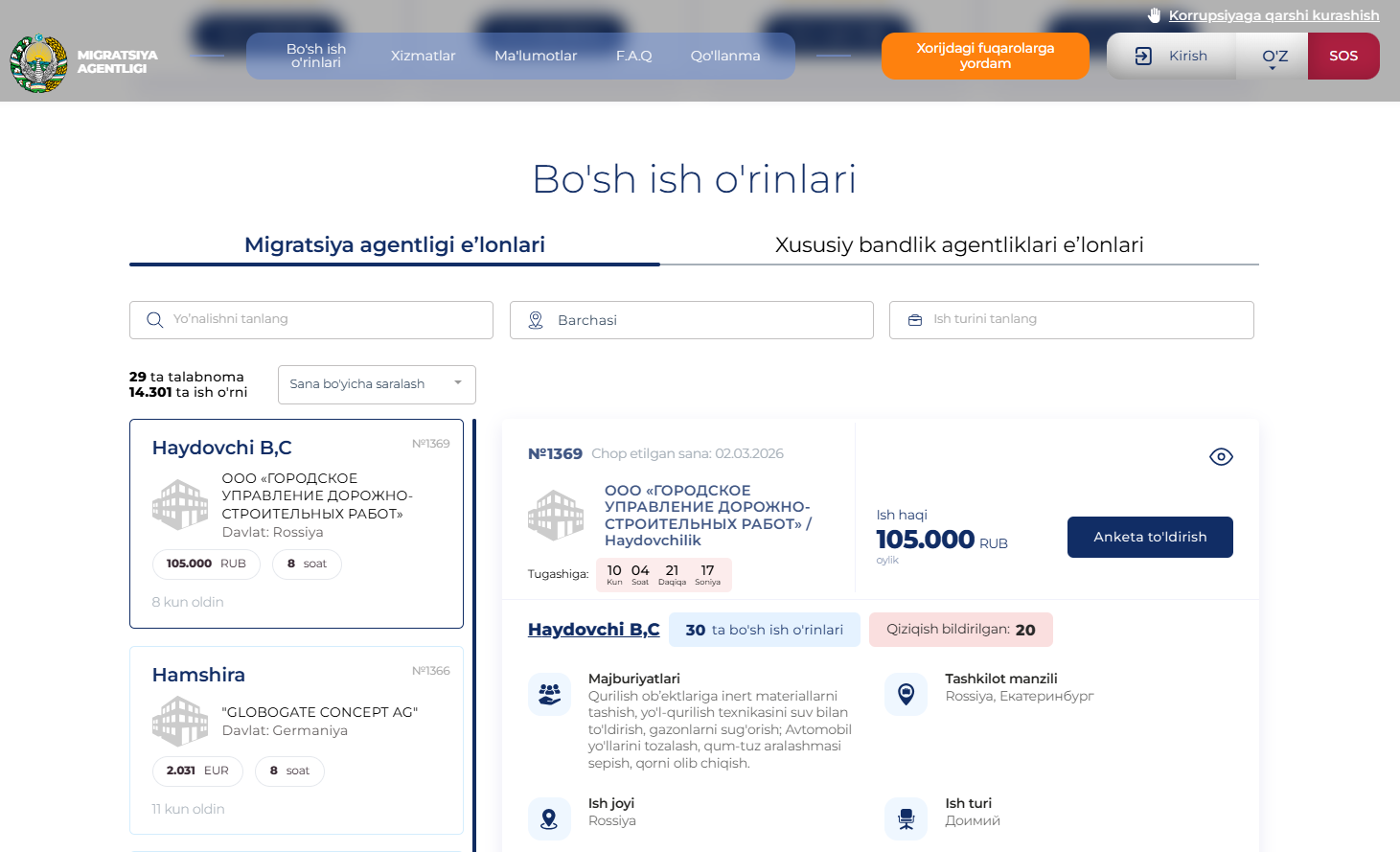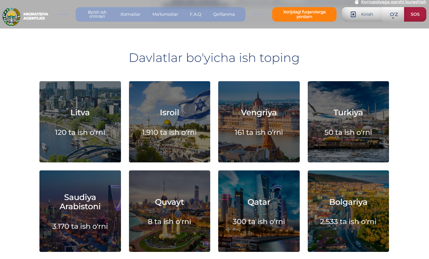 Vazirlar Mahkamasi huzuridagi Migratsiya agentligi (bundan buyon Migratsiya agentligi) mehnat migratsiyasini boshqaradigan davlat tashkiloti bo'lib, dunyoning turli mamlakatlariga ishchilar yuboradi. Migratsiya agentligi faqat Toshkentdagina emas, boshqa viloyatlar va Qoraqalpog'iston Respublikasida filiallari ham bor. Agentlikning joylashuvi haqida ma'lumotni Migratsiya agentligining Telegram kanalidan bilib olishingiz mumkin. Ushbu kanalda ishga yuborish bo'yicha yangiliklar va ish o'rinlari e'lon qilinadi.