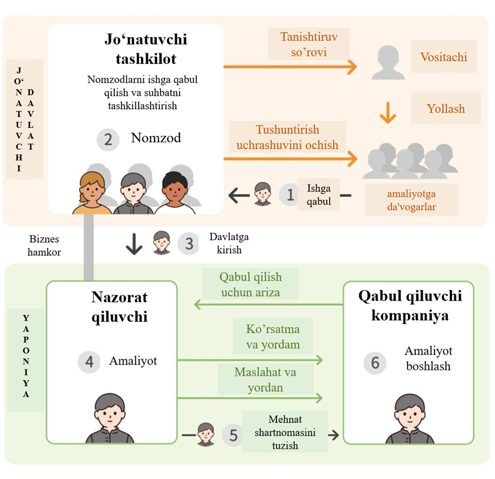 ・Yaponiyadagi uyushmasi bo‘sh ish o‘rinlarini haqida ma'lumot olganidan keyin, chet eldagi yuboruvchi tashkilotga kasbiy malaka amaliyotchisining nomzodlarni tanishtirishni so'raydi.